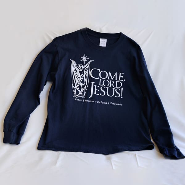 100% cotton navy blue T-Shirt with the white Come, Lord Jesus! logo. Please call the office at 337- 233-6277 to place your order.